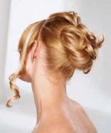 第四步:将马尾辫松松地盘在刚才缠过的辫子根周围。用卡子把辫梢固定别好。注意,马尾辫不要绕得太紧,因为这个头型的整体感觉应该是有一点松弛的。