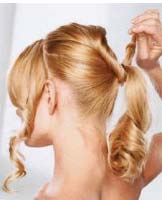 第三步:将刚才在头顶分出的头发梳理通顺,松松地拧在一起,然后把拧好的这绺头发绕在扎起的马尾辫根部周围,绕一到两圈即可。用金属发卡把头发末梢别在马尾辫下面。