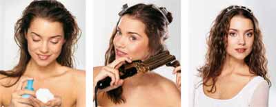 step4 step5 step6 第一步:把稍微有点潮湿的头发分成8股。然后用一只中号的烫发器卷住一股头发的发梢,手拿烫发器向内卷至发根。按此方法将其余头发做完。