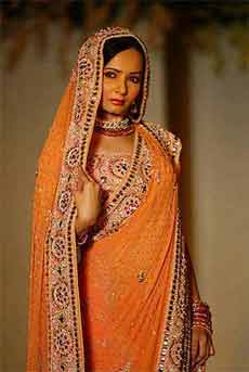 由于印度人对传统新娘服装的需求量很大,这些服装的设计也就成为印度服装设计师经久不衰的设计主题。 10月24日,2004年新娘礼服时装展在新德里举行。(摄影/新华社记者 安治平)