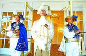 那里已早早等候着65位宾客。婚礼正式开始了,先是由“爵士”主婚人宣读迪士尼的经典对白“终有一天,我的王子会来的”,作为结婚誓词,“王子和公主”从“奴仆”的手上接过一双由天鹅丝绒包裹着的“玻璃鞋”,最后是新人交换结婚戒指,乐队随即奏起乐曲,一对新人和宾客们在欢笑和歌声中翩翩起舞。