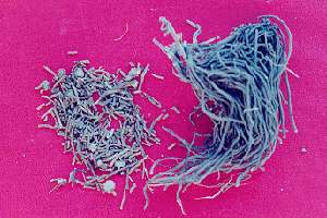 药材 干燥根茎类圆柱形,略横向弯曲,呈结节状,长约1.5-3-5厘米,直径0.5-1-2厘米;表面灰棕色至棕色;质坚脆,易折断,断面略平坦,类白色。根呈细长圆术状,有时弯曲或卷曲,丛生于根茎上,形如马尾,长约1-2.5毫米,表面黄棕色,有细纵皱。质脆,易折断,折断时有粉飞出。断面略平坦,类白色至浅黄棕色,皮部发达,木部很小,仅占直径的1/3。气微弱,味苦。以根色黄棕、粗壮、条匀、断面白色实心者为佳。