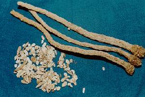 又名大蓝根。为植物菘蓝或草大青的干燥根。呈细长圆术形,长约10-20-30厘米,直径3-8毫米。表面浅灰黄色,粗糙,有纵皱纹及横斑痕,并有支根痕,根头部略膨大,顶端有一凹窝,周边有暗绿色的叶柄残基,较粗的根并现密集的疣状突起及轮状排列的灰棕色的叶柄痕。质坚实而脆,断面皮部黄白色至浅棕色,木质部黄色。气微弱,味微甘。以根平直粗壮、坚实、粉性大者为佳。