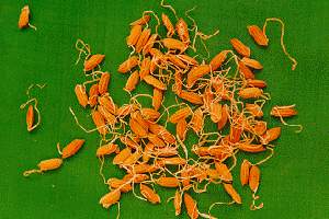 药材 干燥的谷芽,呈长椭圆形而扁,两端略尖,质坚,断面白色,有粉性。气无,味微甘。以粒饱满、均匀、色黄、无杂质者为佳。