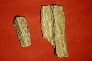 药材 为不规则的块状、颗粒状或多角形,大小不一,块状者可长达6厘米。血红色或黄棕色,表面不平,有光泽。质松脆,捻之即成粉末。气无,味淡,嚼之易碎无沙感。以火燃之易熔,爆炸有声,冒白烟,微有松香气。