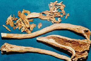 药材 干燥根呈倒圆锥形,扭曲不直。表面深黄色或黄棕色。上部皮较粗糙而下部皮细,上下均有稀疏的疣状支根痕。质硬而脆,易折断;断面深黄色,中间有棕红色圆心。以条粗长、质坚实、色黄、除净外皮者为佳。