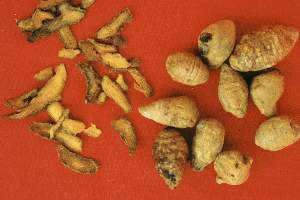 药材 为植物姜黄的干燥根茎,呈圆柱形、卵圆形或纺锤形。表面深黄棕色,常事黄色粉末,并具有明显的环状节及须根残痕。质坚实而重,难折断,断面棕黄色或黄色,角质状或蜡样光泽。微有香缺陷,味苦辛。以圆柱形、外皮有皱纹、断面棕黄色、质坚实者为佳。