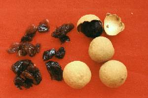 药材 生药为由顶端纵向裂开的不规则块片,表面黄棕色,半透明;靠近果皮的一面皱缩不平,粗糙;靠近种皮的一面光亮而有纵皱纹。质柔韧而微有粘性,常粘结呈块状。气香,味浓甜而特殊。以片大、肉厚、质细软、色棕黄、半透明、味浓甜者为佳。