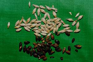 药材 果实呈梭形,表面黄色或淡黄棕色,背面为外稃包围,腹面为内稃包围,有腹沟一条。剥除内外稃后,即为果皮。果皮淡黄色,膜南,种皮薄与果皮难分离,背面基部有长椭圆形的胚,淡黄白色,腹面中央有褐色纵沟1条。胚乳很大,乳白色,粉质。气无,味微甜。以色黄粒大,饱满,芽完整者为佳。