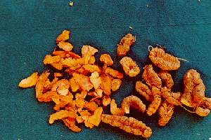 药材 干燥根茎呈扁圆柱形而弯曲,两端圆钝或稍尖,外表紫褐色,有细密环节,顶端有芽或残茎痕,两侧残留细硬须根或白色根痕。质硬脆,易折断,断面棕红色或赤褐色,近边缘有一圈维管束排成的白色小点。气无,味苦涩。以粗大、坚硬、断面红棕色、无须根者为佳。