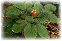 植物形态 多年生草本.茎直立,单一。掌状复叶轮生茎端。一年生为1片三出复叶。二年生有1片五出复叶,以后每年递增1片。4~6年生有3~5片五出复叶,果扁球形,熟时鲜红色。花期6~7月,果期7~9月。
