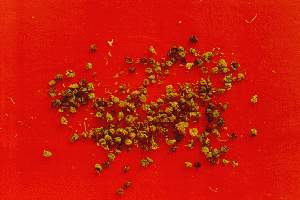 药材 干燥的头状花序呈扁球形,雌性,淡黄色,皱缩卷曲;中央为管状花,两性,黄色,子房棕黄色;底部有总苞,苞片卵形或披针形,枯黄色,边缘膜质;各花均着生于半球状的花托上。味苦,继之有清凉感。