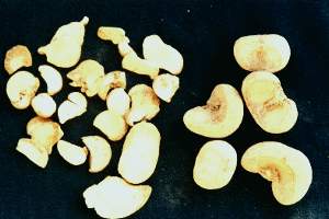 珠贝:为完整的鳞茎,呈扁圆球形。表面白色,外层两枚鳞叶肥厚,略似肾脏形,内表面呈淡黄白色,质地、气味同元宝贝。