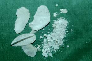 药材 为不规则的片状,大小不一。一面浅粉红色,有彩色光泽,一面乳白色,平滑,有光泽;表面有白粉,质松脆,可层层剥离。气无,味淡,以片大、色白、酥松而不碎者为佳。