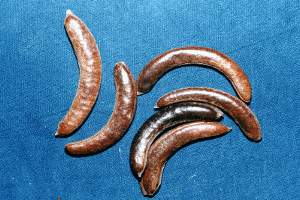 药材 干燥荚果呈圆柱形,略扁,弯曲作镰形。表面紫棕色或紫黑色,被灰白色粉霜,擦去后有光泽,并有细小的疣状突起及线状裂纹,腹缝线突起呈棱脊状,背缝线突起不显著而有棕黄色纵纹,先端有喙状的花柱残基,基部有果柄残痕,质硬而脆,易折断,断面外层棕黄色,中间黄白色,中心较软,有淡绿或淡棕黄色的丝状物与斜向网纹,纵向剖开可见排列整齐的凹窝,很少见种子,臭微,有刺激性,嗅其粉末则作喷嚏,味先甜后辣。以个小饱满、色紫黑、有光泽、无果柄、质坚硬、肉多而粘、断面淡绿色者为佳。