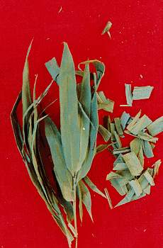 药材 叶呈狭披针形,先端渐尖,基部钝形,边缘之一侧较平滑,另一侧具小锯齿而粗糙;平行脉,小横脉甚显著;叶面深绿色,无毛背面色较淡,基部具微毛;质薄而较脆,气弱,味淡。以色绿、完整、无枝梗者为佳。