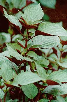 药材 干燥完整的叶呈卵形或圆卵形,多数皱缩卷曲,均有稀毛;先端尖,边缘有锯齿,基部近圆形,有柄。质薄而脆。切碎品多混有细小茎枝。茎四方形,有槽,外皮黄紫色,有时剥落,木质部黄白色,中央有白色疏松的髓。气芳香,味微辛。以叶大、色紫、不碎、香气浓、无枝梗者为佳。