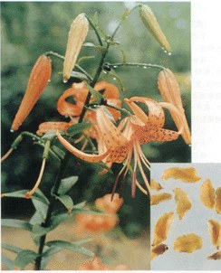植物形态 多年生草本,高1~1.5cm。茎带紫色,有疏或密的白色绵毛。叶互生,披针形或线状披针形,长5~20cm,宽0.5~22cm,向上渐小成苞片状;叶腋内常有珠芽。花序总状;花桔红色,内面密生紫黑色斑点;花被片长7~10cm,开放后向外反卷;花药紫色。蒴果长圆形至倒卵形,长3~4cm。花期6~7月,果期8~10月。