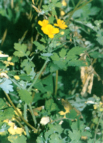 | | 中文名: | 白屈菜 | | 类 别: | 全草类 | | 英文名: | Greater Calandine Herb | | 别 名: | | | 来 源: | 为罂栗科植物白屈菜Chelidonium majus L.的全草。 | | 采 制: | 夏、秋季采割,阴干或鲜用。 | | 性 味: | 性凉,味苦;有小毒。 | | | 植物形态: | 多年生草本,高30~100cm,有黄色乳汁。茎直立,多分枝,嫩绿色,被白粉,疏生柔毛。叶互生,1~2回羽状全裂,基生叶全裂片5~8对,茎生叶全裂片2~4对,边缘有不整齐缺刻,上面近无毛,下面疏生短柔毛,有白粉。花数朵,伞状排列;萼片2,早落;花瓣4,黄色,倒卵圆形,雄蕊多数;子房线形,无毛。蒴果线状圆柱形,成熟时由基部向上开裂。种子多数,卵球形,黄褐色,有光泽及网纹。花期5~8月,果期6~10月。 | | 生长地: | 生于山坡、山谷林边草地;有栽培。主产东北、华北。 | | 化学成份: | 含白屈菜碱(chelidonine)、白屈菜红碱(chelerythrine)、血根碱(sanguinarine)α-,β-,γ-高白屈菜碱(α-,β-homochelidonine)、普托品(protopine)、小檗碱(berberine)、黄连碱等,尚含白屈菜酸、胆碱、芸香甙等。 | | 功能主治: | 镇痛,止咳,平喘,消肿。用于胃痛、慢性支气管炎、百日咳。 | | 附注: | | | |