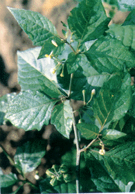 | 植物形态: | 一年生草本,高30~60cm。茎直立,上部多分枝,稀被白色柔毛。叶互生,卵形,长2.5~10cm,宽1.5~5.5cm全缘或具波状齿,先端尖锐,基部楔形或渐狭至柄,叶柄长达2cm。花序短蝎尾状或近伞状,侧生或腋外生,有花4~10朵,花序梗长1~2.5cm;花细小,柄长约1cm,下垂;花萼杯头,绿色,5浅裂;花冠白色,辐射状,5裂,裂片卵状三角形,约3cm;雄蕊5,花药顶端孔裂;子房上位,卵形,花柱中部以下有白色绒毛。浆果球形,直径约8mm,熟时黑色。种子多数,近卵形,压扁状。花果期9~10月。 | | 生长地: | 生于路旁或田野,分布于全国。 | | 化学成份: | 含龙葵碱(solanigrine)、澳茄胺(oslasodine)、龙葵定碱(solanigridine)、皂甙、维生素C、树脂。 | | 功能主治: | 清热解毒,利尿。用于疮痈肿毒、皮肤湿疹、小便不利、老年慢性气管炎、白带过头、前列腺炎、痢疾。 | | 附注: | | |