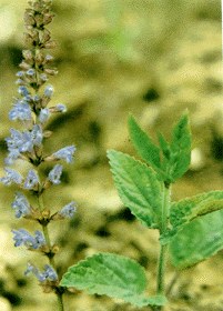 植物形态 一年生草本,高20~70cm。茎方形,单一或分枝,表面紫棕色或绿色,被倒向柔毛。叶对生,全为单叶或茎下部为三出复叶,卵形或卵状椭圆形,长1.3~7cm,边缘有圆齿。轮伞花序6花,集成假总状或圆锥花序;花萼钟状,紫色;花冠蓝紫色或紫色,外被长柔毛;雄蕊2,花丝短,药隔长;子房4裂,花柱着生子房底。小坚果椭圆状卵形,褐色。花期7~8月,果期9~10月。