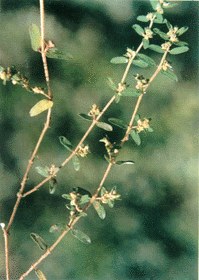 植物形态 一年生葡萄草本,有白色乳汁。茎纤细,近基部分枝,带紫红色,无毛。叶对生,长圆形,长4~10mm,宽4~6mm,先端钝圆,基部偏斜,边缘有细齿,绿色或带红色,两面无毛或疏生柔毛。杯状聚伞花序单生于叶腋;总苞倒圆锥形,淡红色,先端4裂,裂片长三角形;腺体4,横长圆形,有白色花瓣状附属物;子房3室,花柱3,顶端2裂。蒴果三棱状球形,无毛。种子卵形,黑褐色,外被白色蜡粉。花期7~10月,果实7月后渐次成熟。