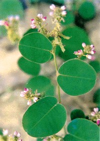 植物形态 半灌木状草本,高30~100cm。茎直立或平卧,密被黄色长柔毛。叶互生,小叶1~3,近圆形,长2.5~4.5cm,宽2~4cm,先端微缺,基部心形,下面密被灰白色绒毛,侧脉羽状;叶柄长1~2cm;托叶1对,披针形,长约0.8cm。总状花序腋生或顶生,苞片卵状三角形,每个苞片内有花2朵;花萼钟开,萼齿披针形,长为萼筒的2倍;花冠紫色,有香气。荚果被短柔毛和钩状毛,荚节3~6。花期6~9月,果期7~10月。
