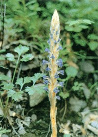 植物形态 一年生寄生草本,高15~40cm,全株被白色绒毛。根茎肥厚。茎直立,粗壮,暗黄褐色。穗状花序顶生,约占茎的1/3~1/2;苞片2,卵状披针形,先端尖锐;花萼褐色,近膜质,萼齿披针形,先端2裂;花冠淡紫黄色,长1.5~2cm,下部为筒形,上部稍弯曲,具2唇,上唇宽,顶端常凹成2裂,下唇3裂,裂片卵圆形,边缘微锯齿;雄蕊4,二强;花柱与花冠近等长,柱头膨大,黄色。蒴果卵状椭圆形,2裂,具多数种子。花果期5~8月。