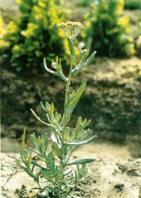 植物形态 二年生草本,主同10~15cm,全株密被白绵毛。茎直立,通常基部分枝,丛生林。叶互生,基生叶花后调落,下部和中产叶匙形或倒披针形,长2~6,宽4~12mm,基部渐狭,下延,两面都有白色绵毛。头状花序多数,排成伞房状;总苞球状钟形,总苞片3层,金黄色,干膜质;花黄色,边缘雌花花冠丝状,中央两性花管状。瘦果长椭圆形,具乳头状突起,冠毛黄白色。花期4~7月,果期8~9月。