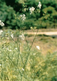 植物形态 一年生草本,高20~60cm,全株光滑无毛,有强烈香气。根细长,圆锥形。茎直立,有条纹。基生叶1~2回羽头全裂,裂片广卵形或楔形,边缘深裂或具缺刻,叶柄长3~15cm;茎生叶互生,2~3回羽状细裂,最终裂片线形,全缘。复伞形花序顶生;无总苞;伞幅2~8;小总苞片线形;伞梗4~10;花小,萼齿5,不相等;花瓣5,白色或淡红色,倒卵形,在小伞形花序外缘的花具辐射瓣。双悬果近球形,光滑,果棱稍凸起。花期4~7月,果期7~9月。