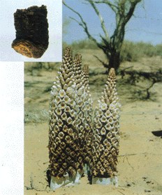 植物形态 多年生寄生草本,高80~100cm。茎肉质肥厚,不分枝。鳞叶黄色,肉质,覆瓦状排列,披针形或线状披针形。穗状花序顶生于花茎;每花下有1苞片,小苞片2,基部与花萼合生;背面被毛,长约为花茎的1倍,花萼5浅裂,有缘毛;花冠管状钟形,黄色,顶端5裂,裂片蓝紫色;雄蕊4。蒴果卵形,褐色。种子极多,细小。花期5~6月。