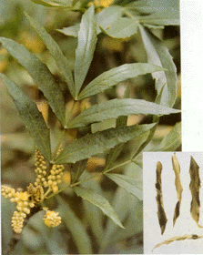 | 附注: | 羽状复叶,小叶5~9,小叶片多皱缩,革质,披针形,每侧有刺5~10。总叶柄长10~20cm,直径约至2mm,上面有凹槽。作同阔叶十大功劳叶。根茎、果实亦入药。 |