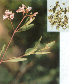 | 植物形态: | 半灌木,高1~1.5m,有乳汗,无毛。枝紫红色或淡红色。叶对生,椭圆状披针形至长圆形,长1~8cm,宽0.5~2.2cm,先端钝圆,有小芒尖,基部宽楔形,边缘有不明显的细锯齿。聚伞花序顶生;花萼5深裂,被短毛;花冠粉红色、浅紫红色,钟形,先端5裂,两面具颗粒状突起;副花冠5;雄蕊5;心皮2,离生。骨突果叉生。种子顶端簇生白色细长毛。花期6~8月,果期9~10月。 |