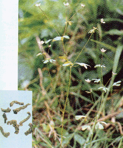 | | 中文名: | 天葵子 | | 类 别: | 根类 | | 英文名: | Muskroot-like-likeSemiaquilegiaRoot | | 别 名: | 紫背天葵、夏无踪。 | | 来 源: | 为毛茛科物天葵Semiaquilegiaadoxioieds(DC·)Makino的块根。 | | 采 制: | 3~5月采挖,除去须根,洗净晒干或鲜用。 | | 性 味: | 块根短柱形或纺锤形,稍弯曲,下部常有分枝,长1~3cm,直径0.5~lcm。表面黑紫色或灰黑色,有不规则纵槽纹及横皱纹;根头部常残留隆起的茎、叶痕。质较硬脆,断面皮部白色,木部黄白色。味微甜。性寒,味甘、苦。 | | | 植物形态: | 多年生草本,高达40cm。茎纤细,疏生短柔毛。基生叶有长柄,为三出复叶,小叶广楔形,3深裂,裂片疏生粗齿,下面带紫色;茎生叶较小,夏末茎叶枯萎。花小,单生于叶腋或茎顶,白色微带淡红,萼片5,花瓣状;花瓣5,匙形,基部囊状;雄蕊8~14;心皮3~5。骨突果2~4。种子黑色。花期3~4月,立夏前果实成熟。 | | 生长地: | 生于丘陵或低山林下、草丛、沟边等阴湿处。主产湖南、湖北、江苏。 | | 化学成份: | 含生物碱、内酯、香豆素、酚性成分及氨基酸等。 | | 功能主治: | 清热解毒,消肿散结。用于痈肿疔疮、乳痈、瘰疬、毒蛇咬伤。 | | 附注: | | | |