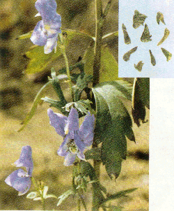 | 植物形态: | 多年生草本。茎直立,下部光滑无毛,上部散生少数贴伏柔毛。叶互生,具叶柄;叶片卵圆形,掌状3深裂, 两侧裂片再2裂,边缘具粗齿或缺刻。总状花序顶生,花序轴与小花埂上密生柔毛;花蓝紫色,萼片5,上萼片高盔状,高2~2.6cm, 侧萼片长1.5~2cm;花瓣2,有长爪,距长0.1~0.3cm;雄蕊多数;心皮3~5。骨突果3~5个。花期6~7月,果期7~8月。 | | 生长地: | 生于山地草坡或灌丛中。主产四川、陕西。 | | 化学成份: | 含乌头碱(aconitine)、中乌头碱(mesaconitine)、塔技乌头胺(talatisamine)、杰斯乌头胺(jasaconitine)、苯甲酰乌头胺(benzoylaconine)、苯甲酰中乌头胺(benzoylmesaconine)和苯甲酰下乌头胺(benzoylhypaconine)等。 | | 功能主治: | 祛风除湿,温经止痛。用于风寒湿痹、关节疼痛、心腹冷痛、寒疝作痛。 | | 附注: | | |