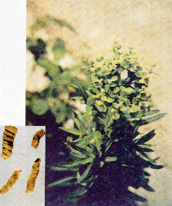 | 植物形态: | 多年生肉质草本,全草含乳汁。根细长,部分呈连珠状。茎直立,淡紫红色。单叶互生,狭披针形或线状披针形,全缘,无柄或具短柄。杯状聚伞花序,通常5~9枝簇生于茎端,基部轮生叶状苞片多枚;苞叶对生;萼状总苞先端4裂,腺体4枚;花单性,无花被;雄花多数和雌花一枚生于同一总苞中;雄蕊、雌蕊各一枚;雌花位于花序中央,子房三角卵形,3室,花柱3,柱头2裂。葫果圆形。花期6~9月。 | | 生长地: | 生于山沟荒地。产于陕西、河南、山西、甘肃、河北。 | | 化学成份: | 含α-、γ-大戟甾醇(α-,γ-euphorbol)、甘遂甾醇(tirucallol),并含13-氧化巨大戟萜醇(13-oxyingenol)、甘遂萜酯A、B(kansuinineA,B)。 | | 功能主治: | 泻水逐饮。用于水肿胀满、胸腹积水、痰饮积聚、气逆喘咳、二便不利。 | | 附注: | | |
