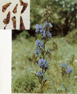 植物形态 多年生草本。茎直立,高50~150cm,无毛。茎中部叶有稍长柄或短柄;叶片纸质或近革质,五角形,3全裂,中裂片宽菱形,渐尖,近羽状深裂,小裂片披针形,上面疏被短曲毛,下面无毛。总状花序窄长;花梗长2~5cm;小苞片线形;尊片5,紫蓝色.上萼片盔形;花瓣2,有长爪,距卷曲;雄蕊多数;心皮3~5。骨突果。花期~9月,果期10月。