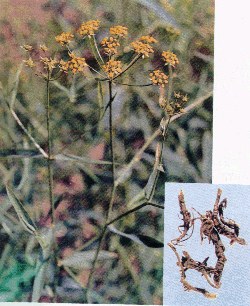 植物形态 多年生草本,高45~70cm。茎丛生或单生,上部多分技。基生叶倒披针形或狭椭圆形,早枯;中部叶倒披针形或宽线状披针形,长3~1lcm,宽0.6~1.6cm,有7~9条纵脉,下面具粉霜。复伞形花序的总花梗细长;总苞片无或2~3,狭披针形;伞幅4~7;小总苞片5;花梗5~10;花鲜黄色。双悬果宽椭圆形,长约3mm,宽约2mm,棱狭翅状。花期8~9月,果期9~10月。