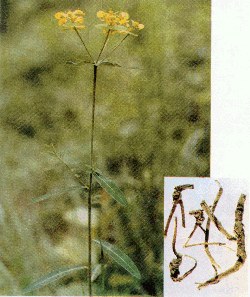 植物形态 多年生草本,全株含乳汁。茎直立,被白色短柔毛,上部分枝。叶互生,长圆状披针形至披针形,长3~8cm,宽5~13mm,全缘。伞形聚伞花序顶生,通常有5伞梗,腋生者多只有工梗,伞梗顶生1杯状聚伞花序,其基部轮生卵形或卵状披针形苞片5,杯状聚伞花序总苞坛形,顶端4裂,腺体椭圆形;雄花多数,雄蕊1;雌花1,子房球形,3室,花柱3,顶端 2浅裂。蒴果三棱状球形,表面有疣状突起。花期4~5月,果期6~7月。