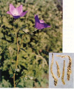 植物形态 多年生草本,有白色乳汁。茎上部稍分枝,微被 白粉。茎中下部叶对生或轮生,上部叶互生,卵形或卵状披针形, 长2.5~6cm,宽1~2.5cm,边缘具不整齐锐锯齿,下面微被白粉。花大,花萼钟状,5裂;花冠阔钟状,先端5裂,紫蓝色或蓝白色;雄蕊5,花丝基部变宽,有短柔毛。蒴果倒卵形,成熟后顶端5瓣裂,具宿萼。花期7~9月,果期8~10月。