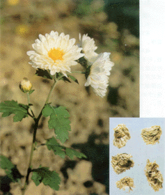 | | 中文名: | 菊花 | | 类 别: | 花类 | | 英文名: | Chrysanthemum Flower | | 别 名: | 滁菊、毫菊、杭菊、杯菊、贡菊。 | | 来 源: | 为菊科植物菊Chrysanthemum morifolium Ramat.的头状花序。 | | 采 制: | 9~11月花盛开时分批采收,阴干、焙干、或熏、蒸后晒干。 | | 性 味: | 花序扁球形、不规则球形或稍压扁,直径多1.5~4cm。总苞由3~4层苞片组成,外围为数层舌状花,类白色或黄色,中央为管状花。气清香,味甘、微苦。性微寒,味甘、苦。 | | | 植物形态: | 多年生草本,高60~150cm。茎直立,多分枝,具细毛或绒毛。叶互生,卵形至披针形,长约5cm,宽3~4cm,略作羽状分裂,边缘有粗锯齿,下面具白色绒毛;有叶柄。头状花序单生枝端、叶腋,直径2.5~5cm;总苞半球形,总苞片3~4层,外 层绿色,线形,有白色绒毛,边缘膜质;舌状花白色、黄色、淡红色或微带紫色,雌性;管状花黄色,两性。花期9~11月。 | | 生长地: | 我国中部、东部、西南广泛栽培。 | | 化学成份: | 含挥发油,油中主要为菊酮(chrysanthenone)、龙脑、龙脑乙酸酯;并含腺嘌呤、胆碱、水苏碱、刺瑰甙(acaciin)、木犀草甙、大波斯菊式(cosmosiin)、香叶木素-7-葡萄糖甙、菊甙(chrysanthemin)、菊花萜二醇(chrysandiol)。 | | 功能主治: | 散风清热,平肝明目。用于风热感冒、头痛眩晕、目赤肿痛。 | | 附注: | | | |