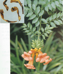 | | 中文名: | 凌霄花─美洲凌霄 | | 类 别: | 花类 | | 英文名: | Common Trumpetcreeper Flower | | 别 名: | | | 来 源: | 为紫葳科植物美凌霄Campsis radicans (L.)Seem.的花。 | | 采 制: | 夏、秋季花盛开进采摘,晒干或低温干燥。 | | 性 味: | 多皱缩或折迭,长5~8cm。花萼长1~2cm,简部直径5~6mm,暗棕色,质厚,裂片长约占1/3, 三角形,无纵脉纹。花冠外面红棕色,近裂片处有棕色小点(大型腺毛);内面暗棕色;裂片宽1.7~2.5cm;雄蕊一枚,子房上位,2室,胚珠多数,柱头2裂呈扁的长圆形,常反卷。气微香,味微苦而略酸。 | | | 植物形态: | 多年生木质藤本。羽状复叶对生;小叶7~11,卵形至卵状披针形,先端长尖,基部不对称,边缘有锯齿,下面脉间有细柔毛。由三出聚伞花序集成顶生圆锥花丛;花萼钟形,肉质,5裂占上部1/3,萼齿三角形;花冠鲜红色,漏斗状,直径约4cm,先端5裂,雄蕊4,二强;子房2室。蒴果长如豆荚。种子多数。花期7~10月,果期11月。 | | 生长地: | 上海、南京一带有栽培。 | | 化学成份: | 含辣椒黄素(capsanthin)、花青素-3-芸香糖甙(cyanidin-3-rutinoside)。 | | 功能主治: | 同凌霄。 | | 附注: | | | |