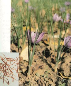 化学成分 含番红花甙-1,2,3,4(crocin-1~4)、番红花苦甙(picrocrocin)、番红花酸二甲酯(crocetin dimethyl ester)、α-番红花酸(a-crocetin)番红花醛(safranal)、挥发油等。