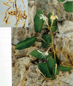 植物形态 缠绕半灌木,常绿。幼枝密被柔毛和腺毛,老枝棕褐色,呈条状剥离,中空。叶对生,卵形至长卵形,长3~8cm,宽1.5~4cm,初时两面有毛,后则上面无毛。花成对腋生,花梗及花均有短柔毛;花冠初开时白色,后变黄色,外被柔行和腺毛,花冠筒细长;雄蕊5,伸出花冠外;子房下位。浆果球形,熟时黑色。花期4~6月,果期7~10月。