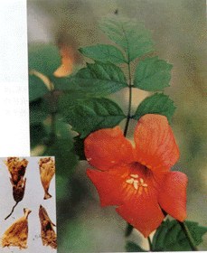 植物形态 落叶木质藤本。羽状复叶对生;小叶7~9,卵形至卵门面披针形,长3~7cm宽15~3cm,先端长尖,基部不对称,两面无毛,边缘疏生7~8锯齿,两小叶间有淡黄色柔毛。花橙红色,由三出聚伞花序集成稀疏顶生圆锥花丛;花萼钟形,质较薄,绿色,有10条突起纵脉,5裂至中部,萼齿披针形;花冠漏斗状,直径约7cm。蒴果长如豆荚,顶端钝。种子多数。花期6~8月,果期11月。