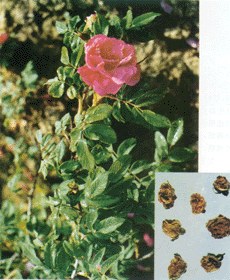 植物形态 落叶灌木,高约2m。茎枝有皮刺、腺毛,并密被绒毛。羽状复叶互生;小叶5~9,椭圆形或椭圆状倒卵形,长2~5cm,边缘有细锯齿,下面密被灰白色柔毛及腺体;叶柄、叶轴有绒毛、刺毛和皮刺;托叶大部附着于叶柄,边缘有腺点;叶柄基部的刺常成对着生。花单生或数朵聚生,有浓香气; 萼片5,披针形;花瓣5或重瓣,紫红色至白色;雄蕊多数,着生于花托边缘的花盘上;雌蕊多数,包于花托内。蔷薇果扁球形,砖红色,直径2~2.5cm,花期5~8月,果期6~9月。