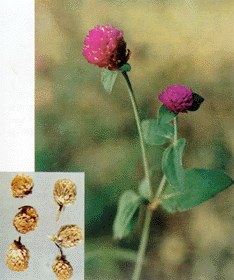 植物形态 一年生草本,高30~80cm,全株有灰色长毛。茎直立,分权。叶对生;叶片长圆形至椭圆满状披针形,长3~10cm,宽2~5cm,全缘,先端尖,基部渐狭成叶柄,两面有细长白柔毛。头状花序圆球形,基部有叶状苞片2,对生;花有小苞片3,外1片较短小,内2片淡紫色、紫红色或白色,膜质,有光泽,长于花被;花被片5,密被长柔毛。胞果卵圆形,内有棕色细小种子1粒。花期7~10月。