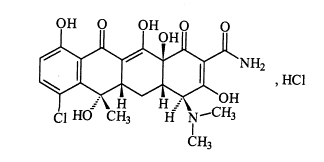 【分子式成分】化学名为6-甲基-4-(二甲氨基)-3,6,10,12,12a,-五羟基-1,11-二氧代-7-氯-1,4,4a,5,5a,6,11,12a-八氢-2-并四苯甲酰胺盐酸盐。分子式:C22H23ClN2O8·HCl。分子量:515.35。