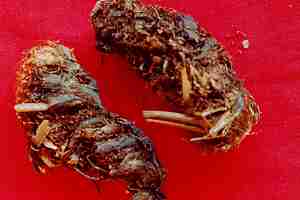 呈圆锥状或三角圆锥状,稍弯曲,顶端有时分支;长10-20cm,直径4-8cm。表面棕褐色,密被斜生的叶柄残基及须根,无鳞叶,叶柄残基呈扁圆柱形,边缘钝圆,具耳状托叶翅,但翅易脱落,多已不存在或呈撕裂状,质硬,折断面呈新月形或扁圆形,多中空,可见“U”形维管束,托叶翅的后壁组织连成一片,断面呈一条黑线,叶柄基部生出弯曲的须根,常扁压,多分支,气微弱而特异,味淡微涩。