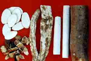 | 为薯蓣科多年蔓生草本植物薯蓣的根茎。主产于河南、江苏、广西、湖南等地。霜降后采挖。刮去粗皮,晒干或烘干,为“毛山药”;再经浸软闷透,搓压为园柱状,晒干打光,成为“光山药”。润透,切厚片,生用或麸炒用。 【应用】 1.用于脾胃虚弱证。山药能平补气阴,且性兼涩,故凡脾虚食少,全倦便溏,及妇女带下,儿童消化不良的泄泻等,皆可应用。常配人参、白术、茯苓等同用,如参苓白术散。 2.用于肺肾虚弱证。山药既补脾肺之气,又益肺肾之阴,并能固涩肾精。①治肺虚咳喘,或肺肾两虚久咳久喘,常配人参、麦冬、五味子等同用;②治肾虚不固的遗精、尿频等,常配熟地黄、山茱萸、菟丝子、金樱子等同用;③肾虚不固,带下清稀,绵绵不止,可与熟地黄、山茱萸、五味子等同用。 3.用于阴虚内热,口渴多饮,小便频数的消渴证。有益气养阴生津止渴之效。常配黄芪、生地黄、天花粉等同用 【用法用量】煎服,10~30g。大量60~250g。研末吞服,每次6~10g。补阴生津宜生用;健脾止泻宜 炒用。 《本经》 | |
